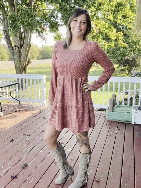 This ribbed knit dress is easy to wear and super comfortable. It has a high waist that gives a nice shape, long sleeves for a cozy feel, and side pockets for convenience. The fit is relaxed but still flattering, making it great for everyday wear or when you want to dress it up a little.
